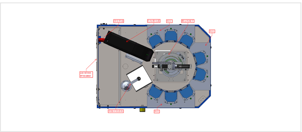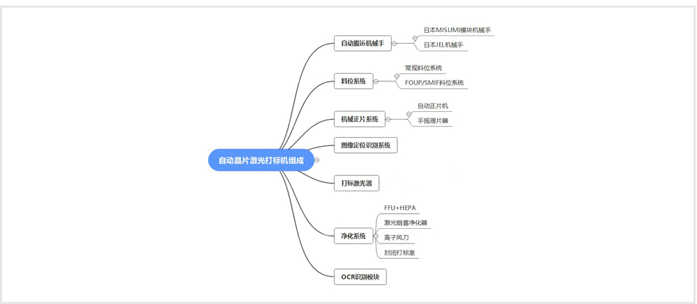 通過機械手搬運晶片,用特定激光器在晶片指定位置打標,實現(xiàn)對晶片的自動標記??蓪崿F(xiàn)軟打標和硬打標??纱驑税雽?dǎo)體材料覆蓋:、Si、SiC、GaAs、InP、Al2O3(藍寶石)、Ge等材料。